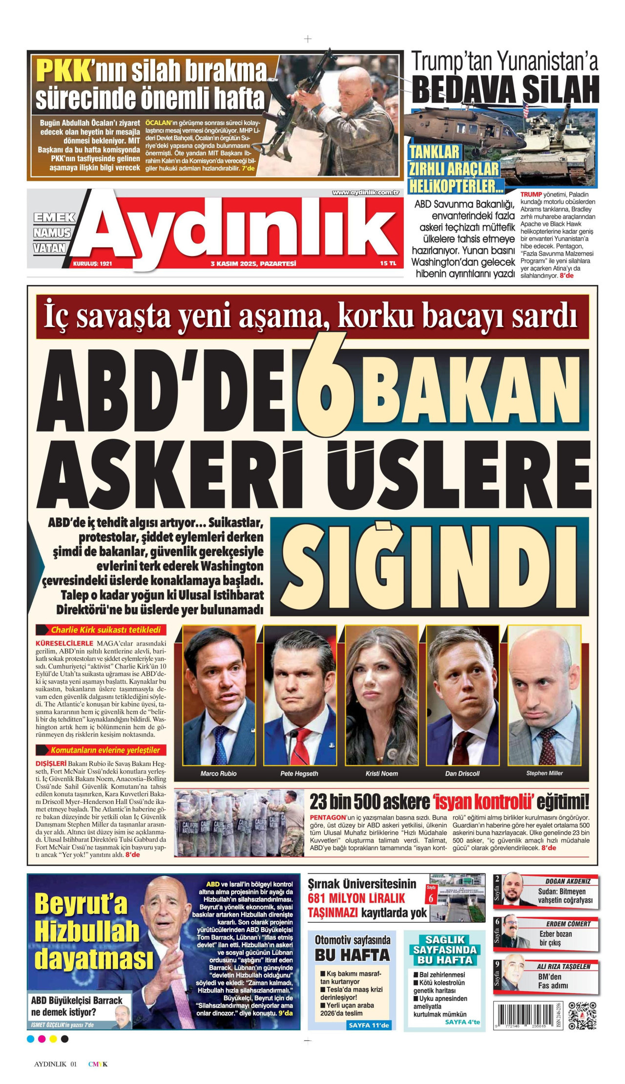 AYDINLIK GAZETESİ Gazetesi 03 Kasım 2025, Pazartesi Günü Manşeti